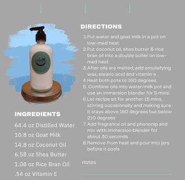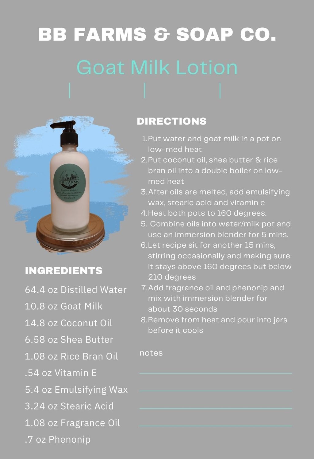 BB Farms & Soap Co. Goat Milk Lotion Recipe (you can click each ingredient to take you to the blog page with all the amazing facts)