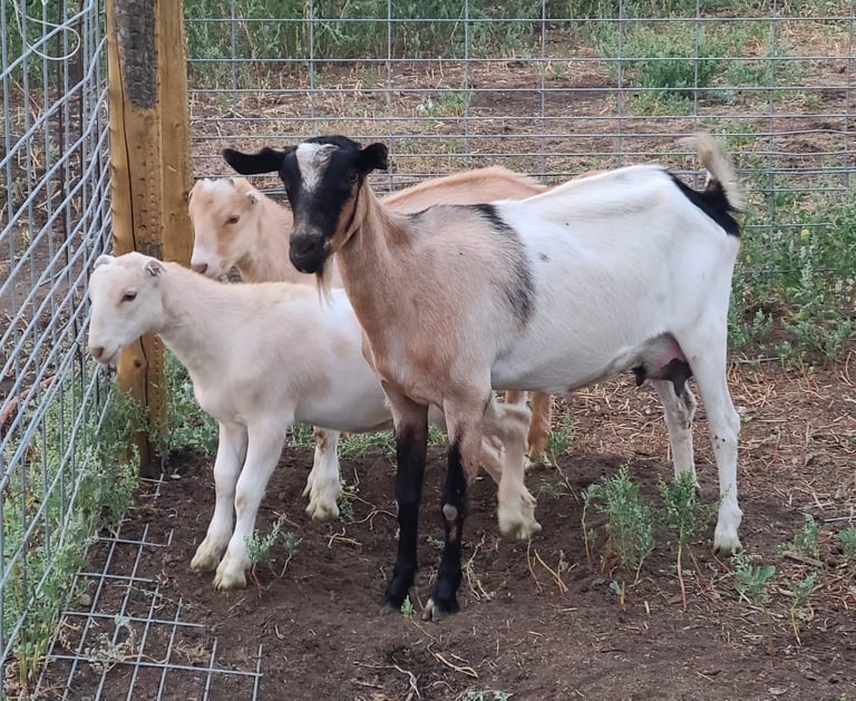 By May of 2021 we had 2 dogs, 7 cats (we inherited with the place), 2 horses, 7 chickens, and 9 bumb lambs. Our little homestead was so fun, we were taking it all in and learning something new every day. We were making improvements to the barn and the fencing and every little thing that needed to be done. The lambs got bigger and eventually, we weaned them off their bottles and they went to eating hay and grain and grass. Then one day I was scrolling Facebook and saw an ad for 3 goats, a nanny, and her two kids. Surprisingly it was in a town not far away! Jordan is very secluded and we are almost 100 miles from the nearest Wal-Mart or fast food. Our community has 2 bars, 1 grocery store, a restaurant, a school, and a gas station. So when I saw goats for sale and they were only 115 miles from me, I jumped at the chance! I called up a friend and we made a plan to stop and get them with her trailer when she was on her way home from the sale barn.